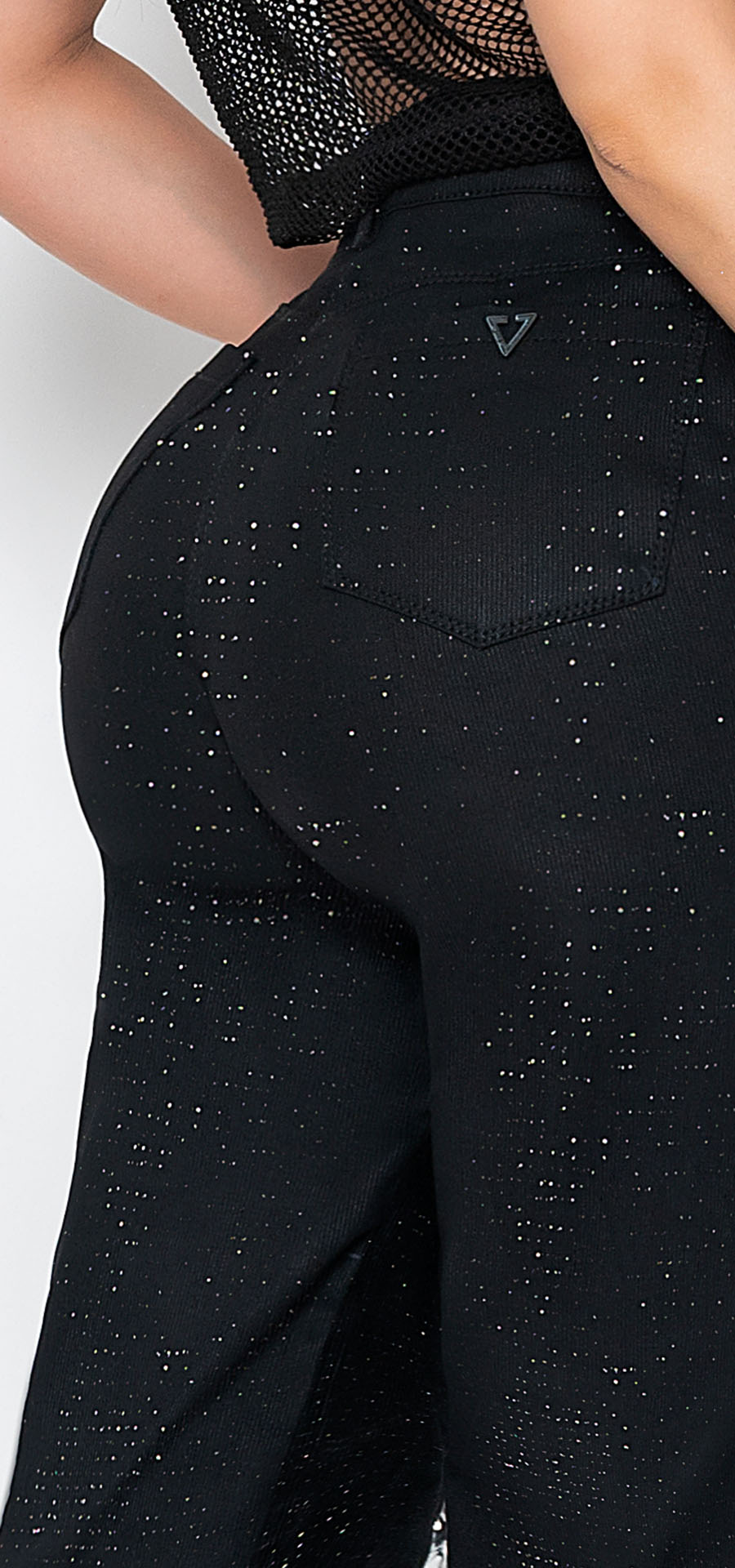 Jeans palazzo. Tiro alto 1 botón. Con brillos tono negro