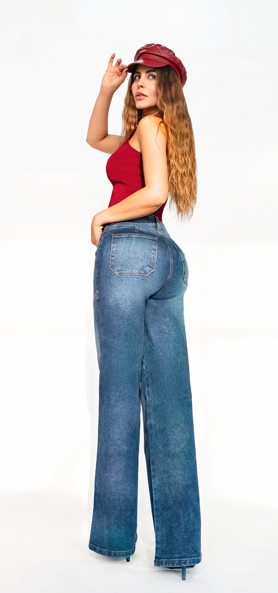 Ref. 700-1784 Jeans palazzo. Tiro alto 1 botón. azul medio con taches