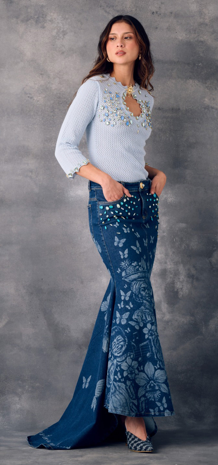 Representa la esencia de la colección: un homenaje a la riqueza cultural que habita en cada detalle. La blusa tejida, delicada y llena de texturas, evoca la tradición artesanal de nuestras manos creadoras; mientras que la falda en denim con retratos y símbolos grabados en su superficie convierte la prenda en un lienzo de memoria y orgullo.