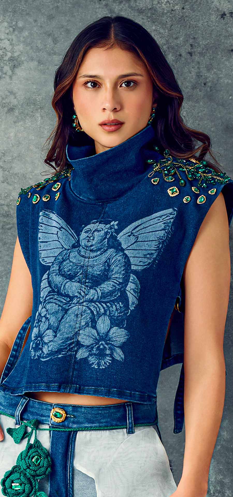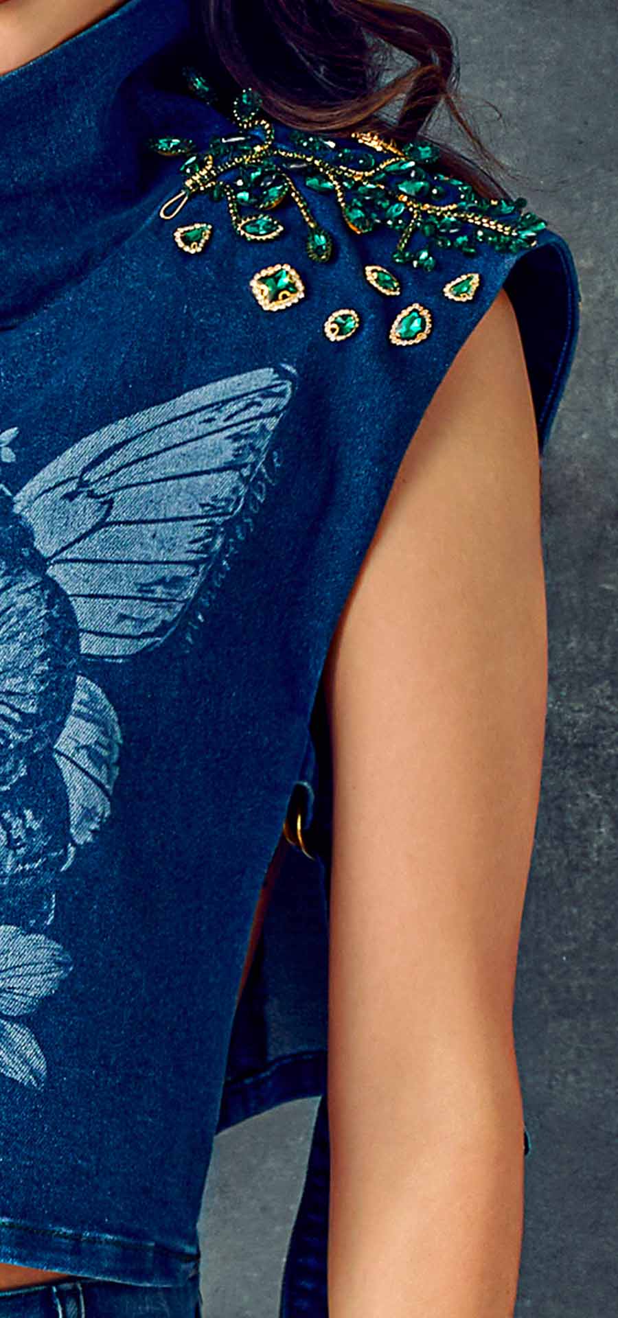 El peto de cuello tortuga, grabado en láser, lleva en su superficie la impronta de la gorda de botero, acompañada de las alas de las mariposas amarillas de Gabriel García Márquez: un diálogo entre pintura y literatura, entre lo visible y lo mágico.