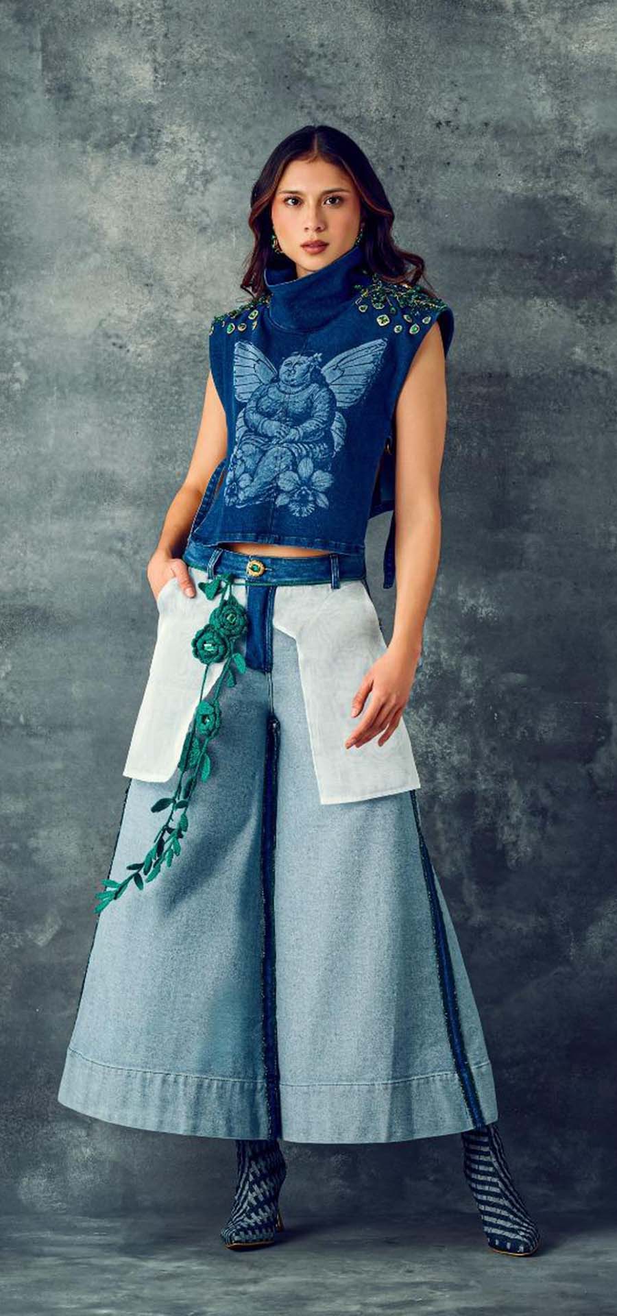 Finalmente, los botines tejidos en tiras de denim reciclado completan el relato, conectando